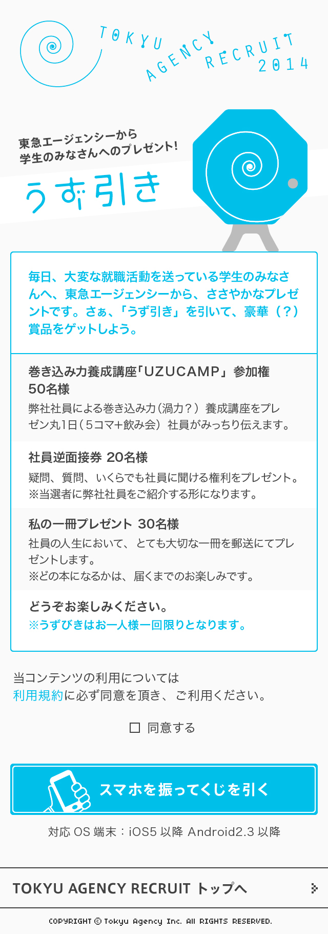 東急エージェンシー2014年度新卒採用スペシャルサイト今年のテーマは「うず」。就活生の心くすぐるような演出で、広告業界の楽しさや東急エージェンシーの自由度の高い伸び伸びした社風が伝わるようなサイトになるよう心がけました。
